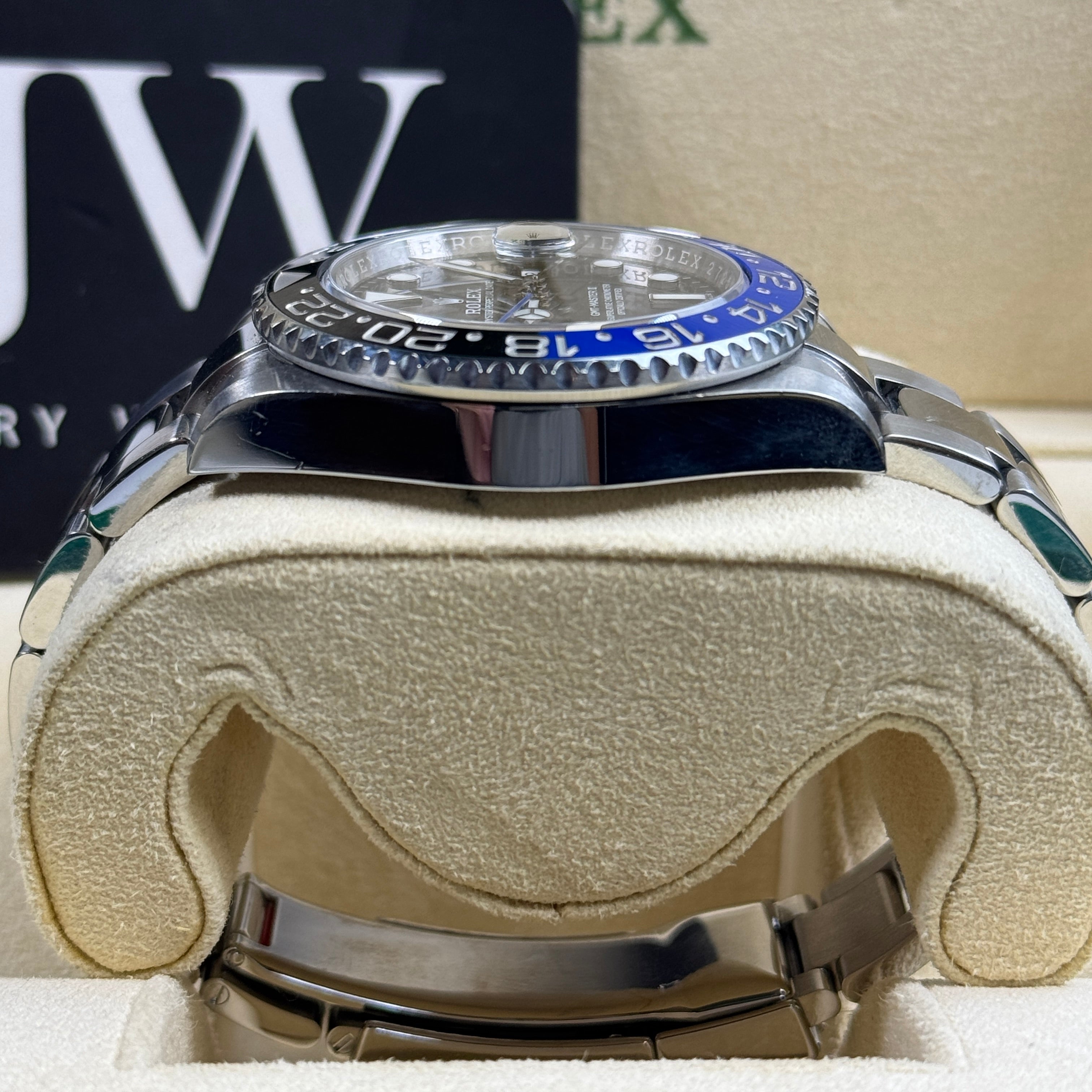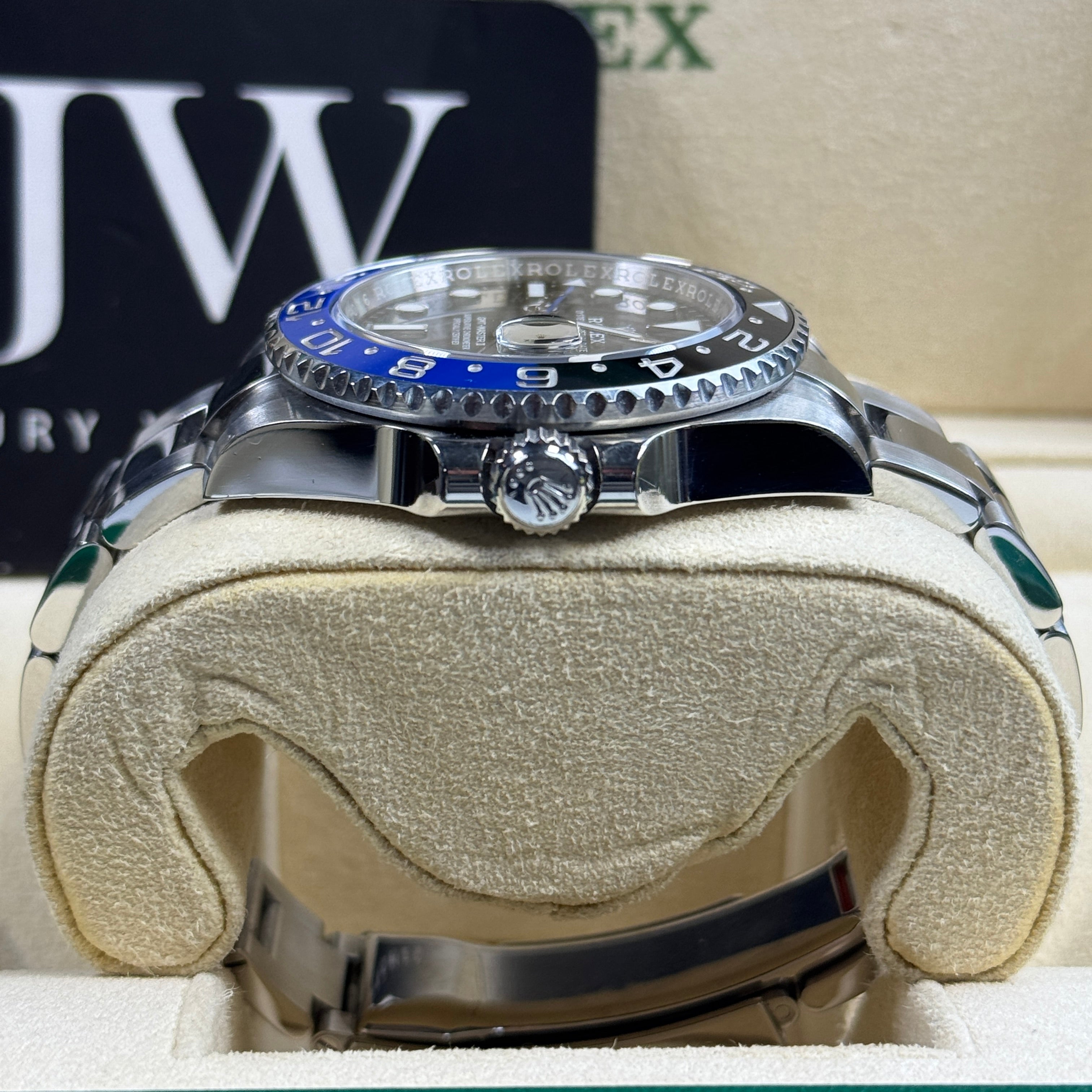 JJW Watches presents to you the incredible Rolex 116710BLNR “Batman” for sale on the classic Oyster bracelet. If you’re looking to buy a Rolex GMT-Master II on Oyster, this is the reference most collectors search for. The 40mm Oystersteel case wears perfectly day-to-day, while the black and blue ceramic Cerachrom insert delivers that signature “Batman” look with exceptional scratch and fade resistance.