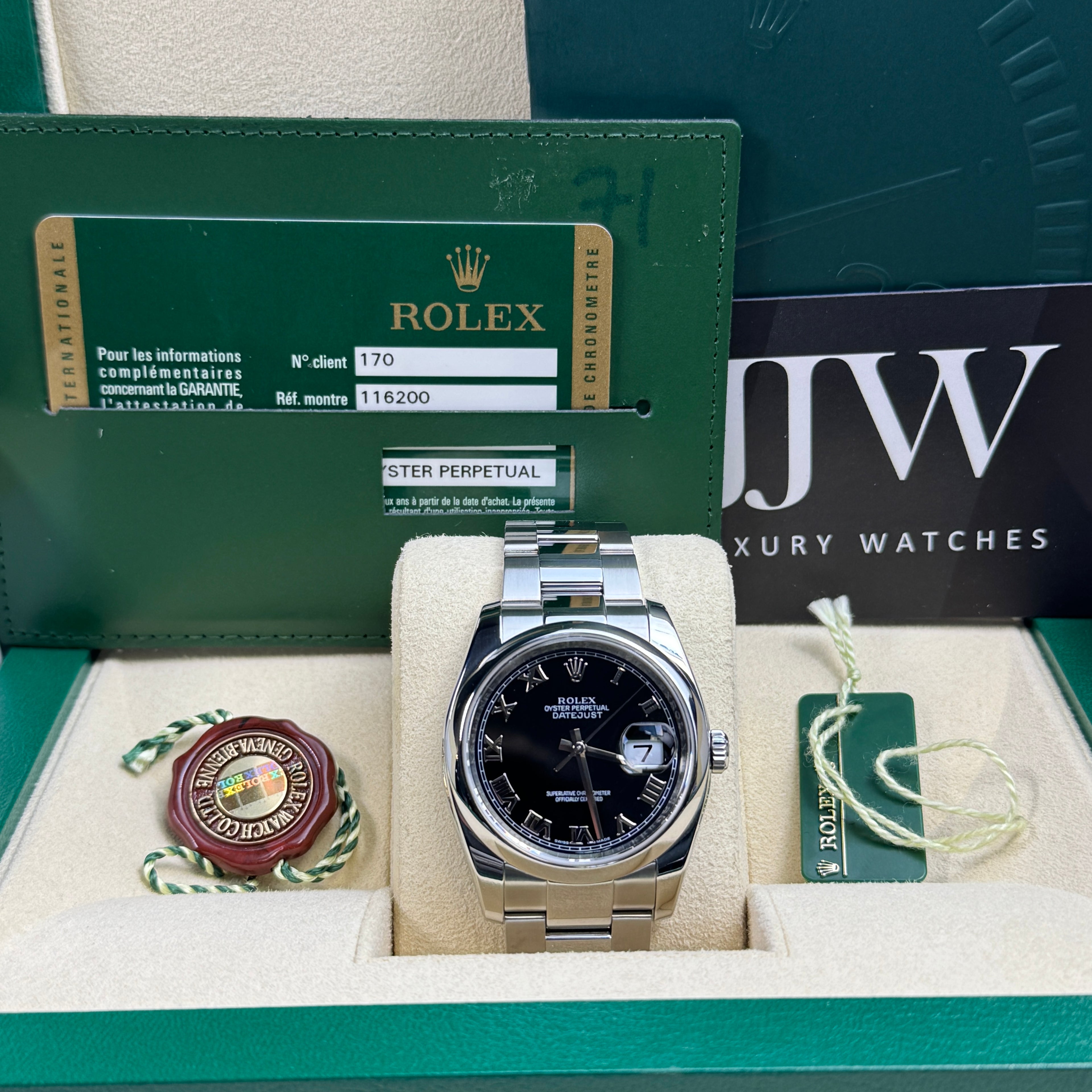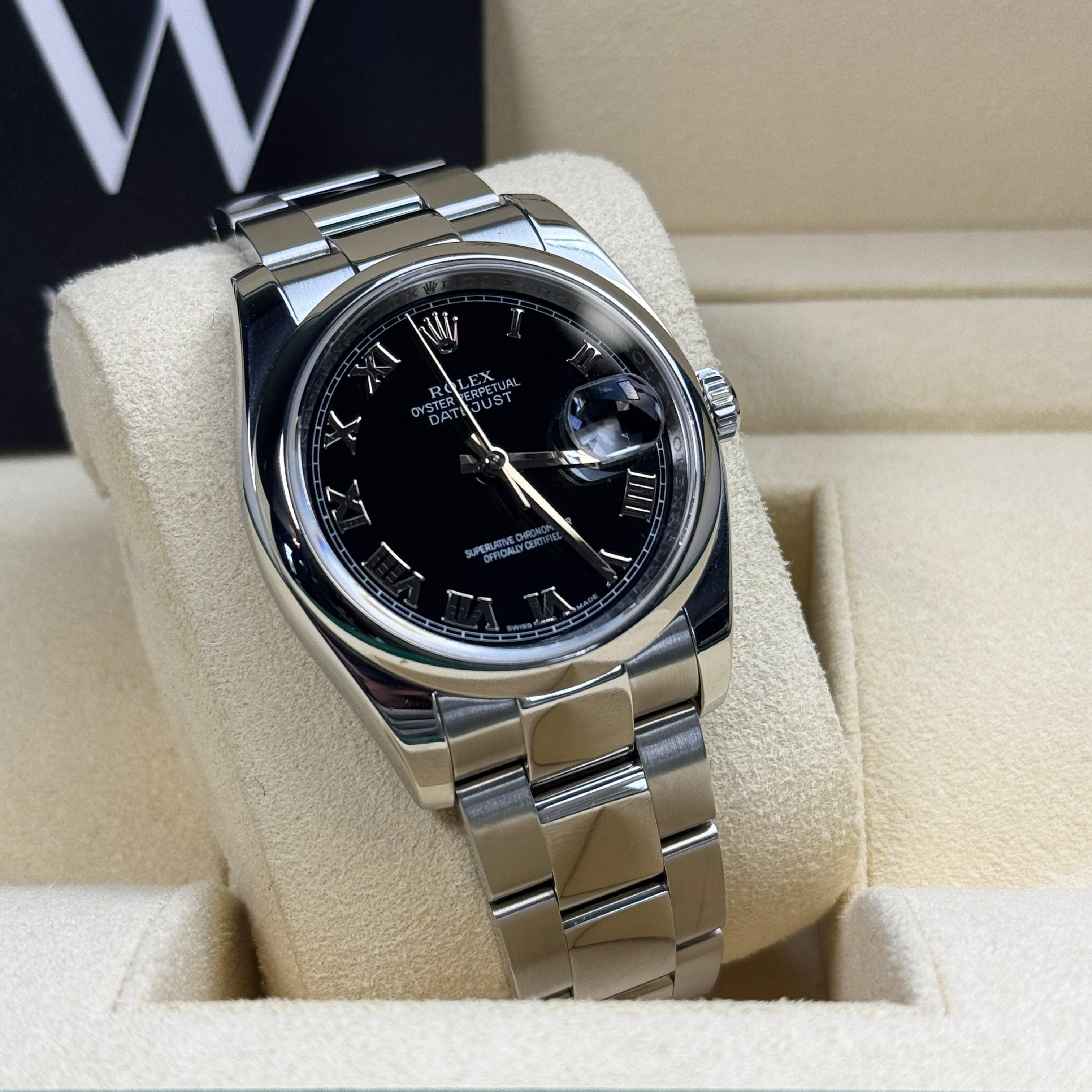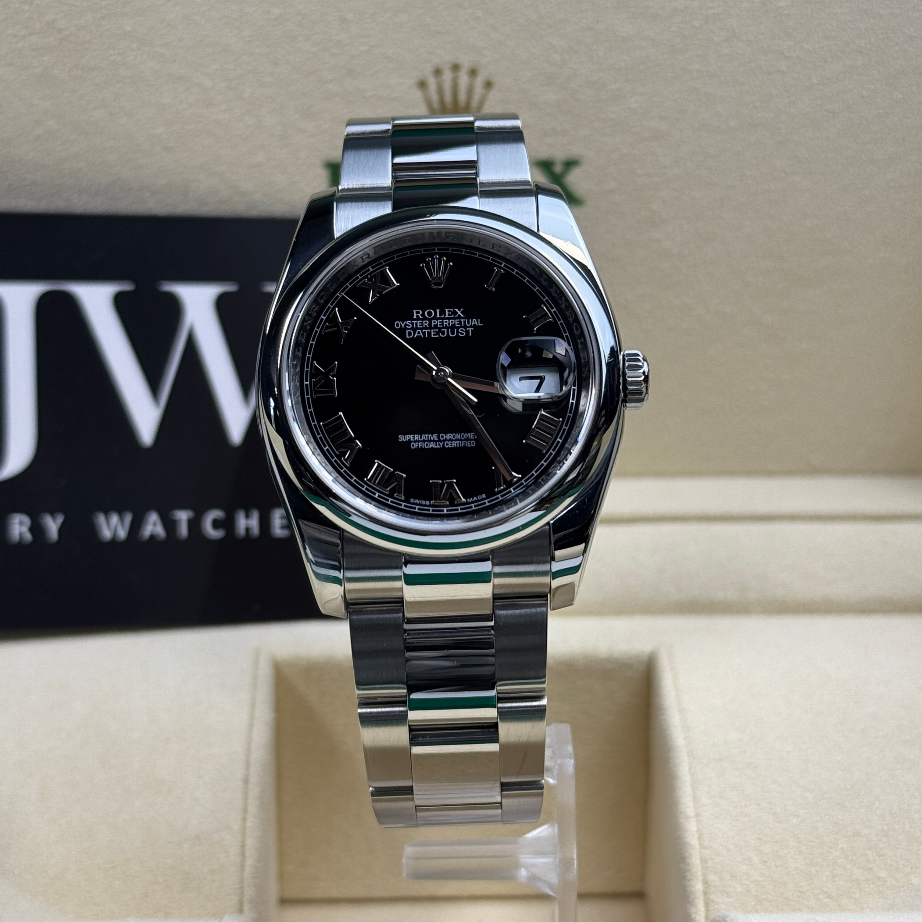 Whether for daily wear or special occasions, the 36mm Rolex Datejust 116200 with its striking black Roman numeral dial and Oyster bracelet is the perfect everyday watch.