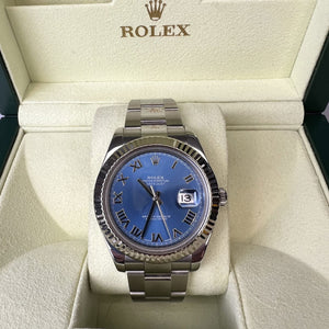 The Rolex 41mm Datejust 2 116334 with an Azzurro blue dial and Roman numeral indices is a true expression of Rolex's expertise in combining luxury with functionality. Its distinctive design, featuring the signature date window and a captivating blue dial, makes it a perfect companion for any occasion, from formal events to casual outings. Experience the beauty, precision, and reliability of a Rolex timepiece with this elegant Datejust.