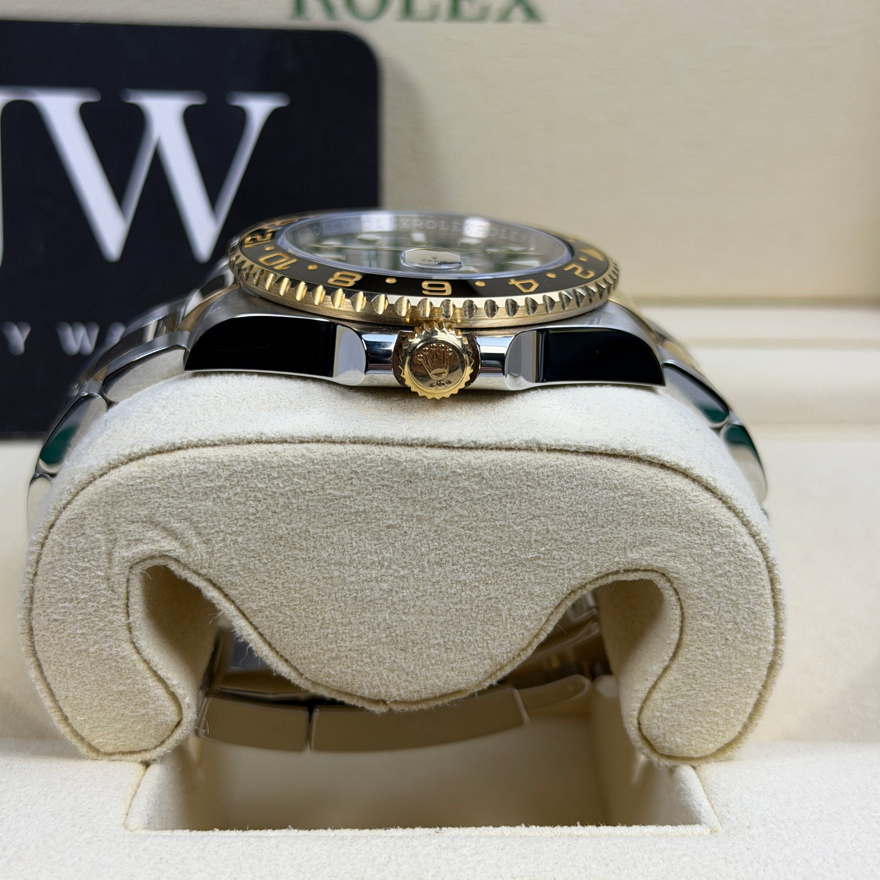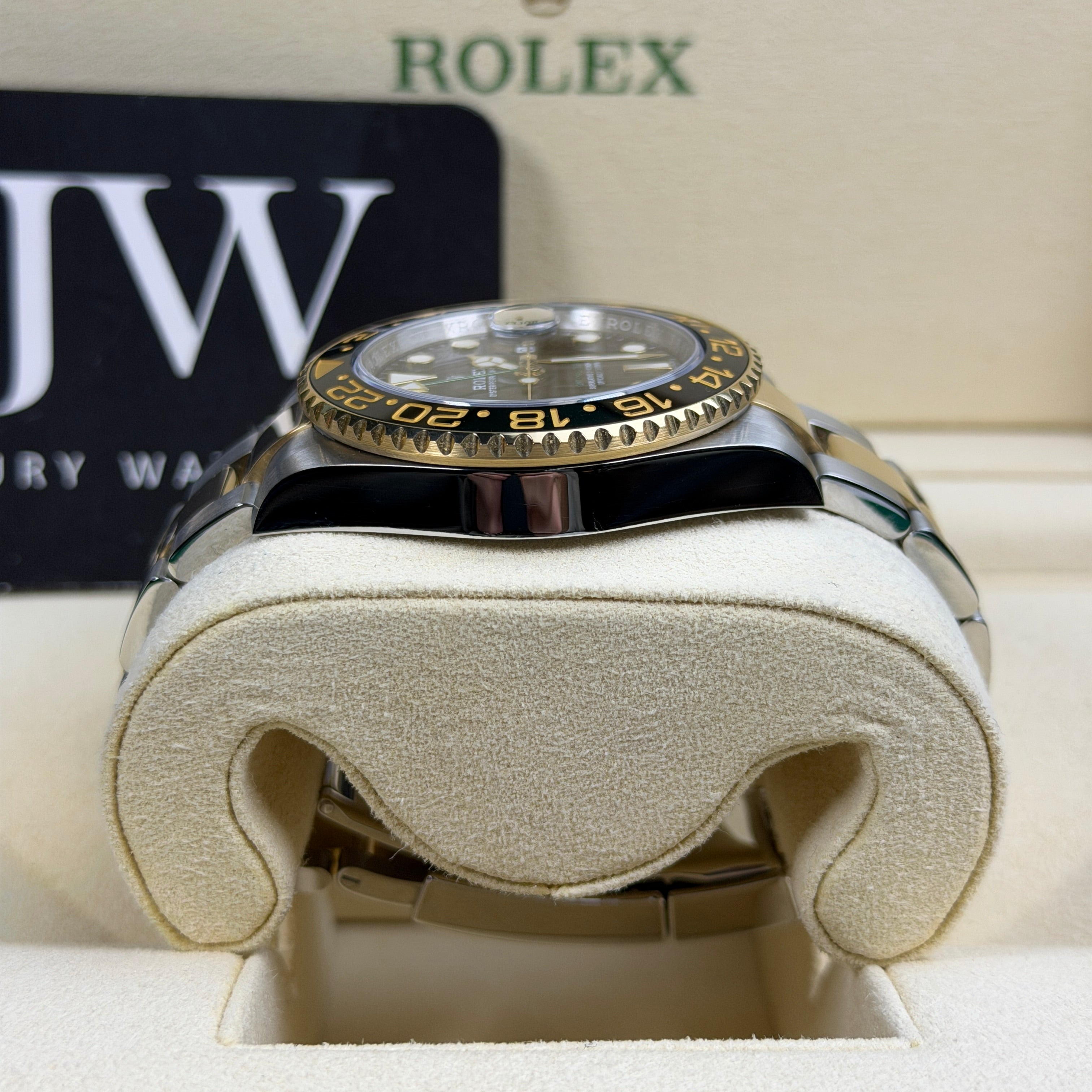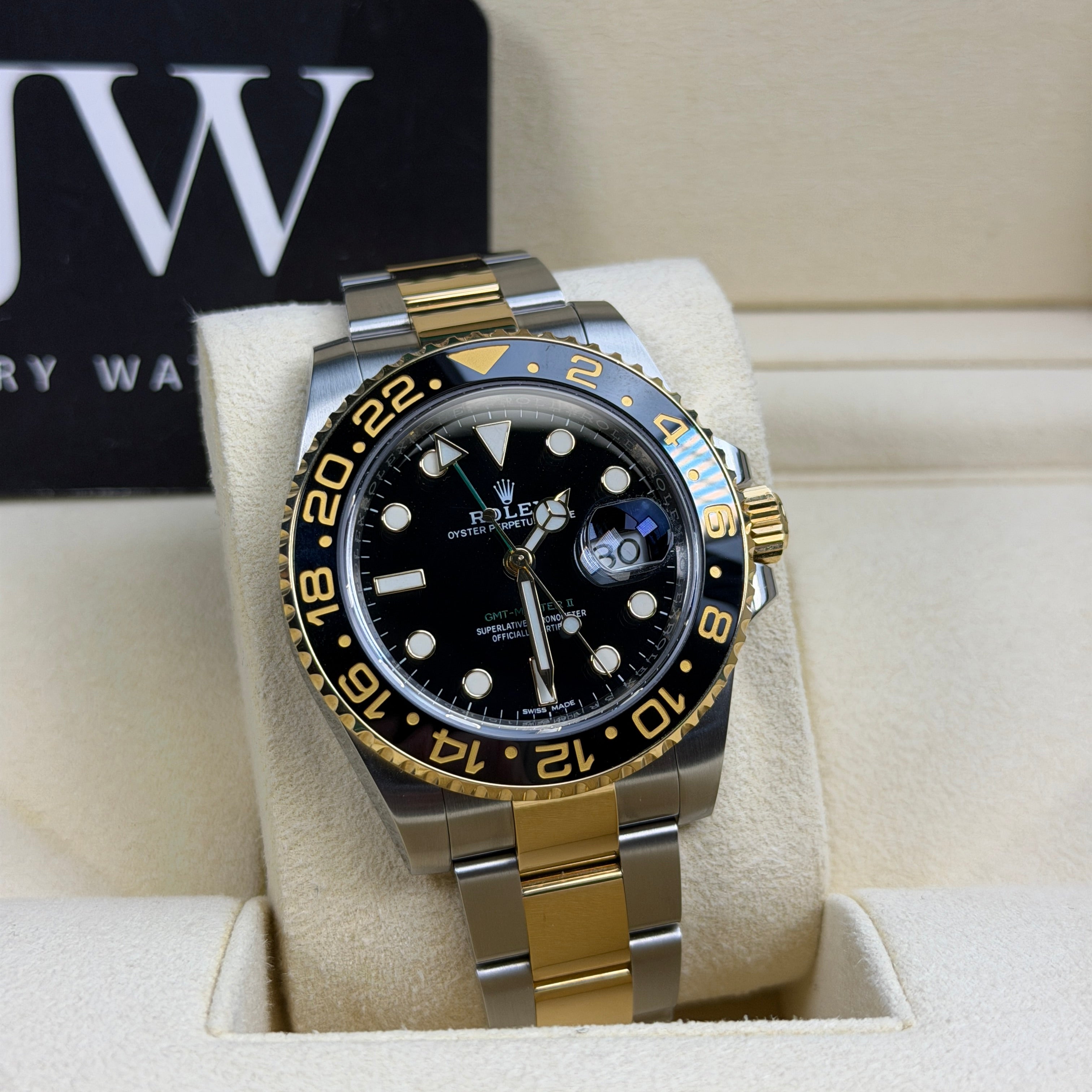 JJW Watches presents this pre-owned Rolex GMT-Master II 116713LN, one of the most sought-after two-tone Rolex sports models on the market. If you are looking to buy a discontinued Rolex GMT-Master II that offers luxury, durability, and everyday versatility, this reference delivers all three with unmistakable presence. The combination of Oystersteel and 18ct yellow gold gives the 116713LN its signature look, while the black Cerachrom bezel and matching black dial create a bold and modern aesthetic that stands out without ever feeling overstated.